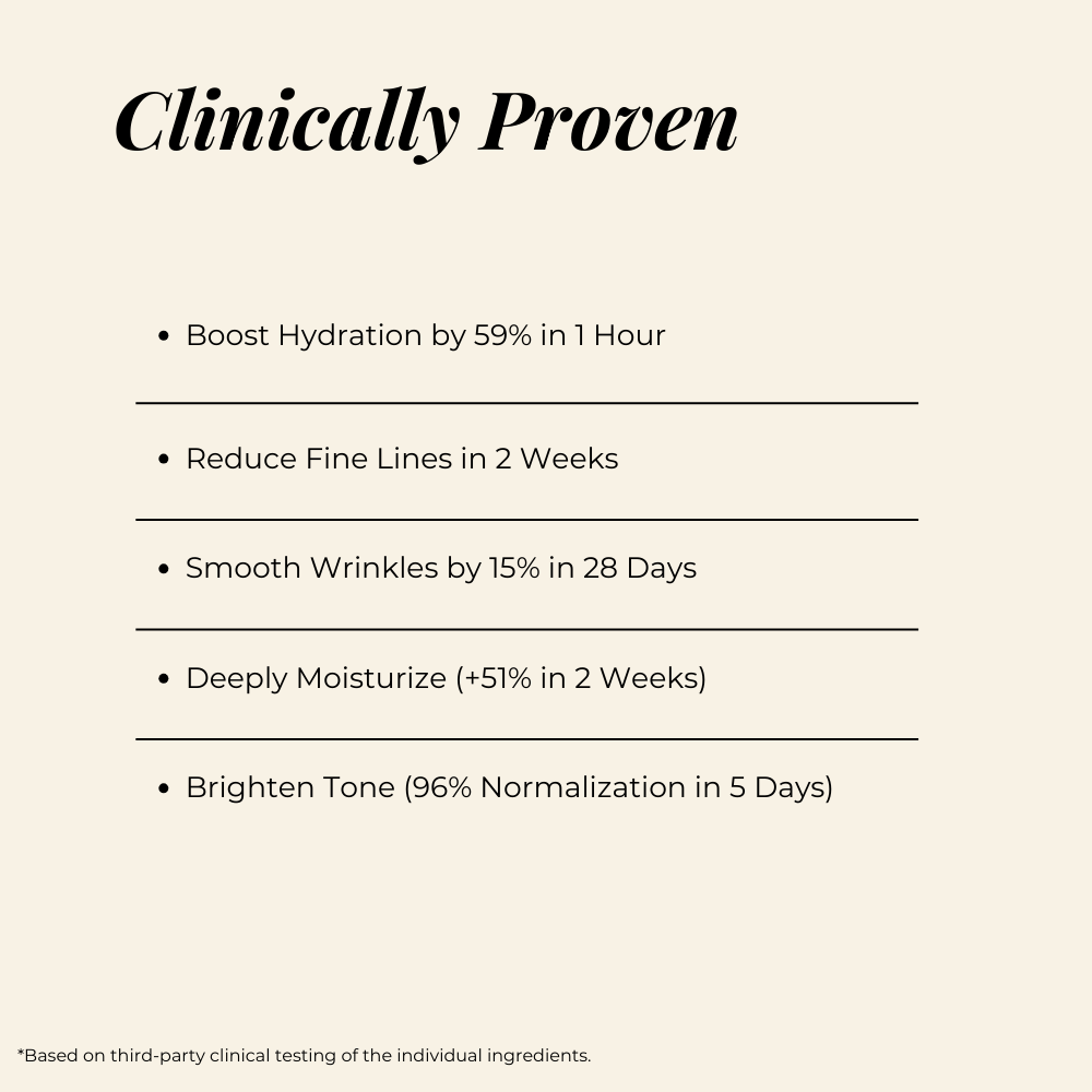 Study Findings: 30-day clinical trial showed +23.8% hydration and 10–15% elasticity improvement in 35 participants.