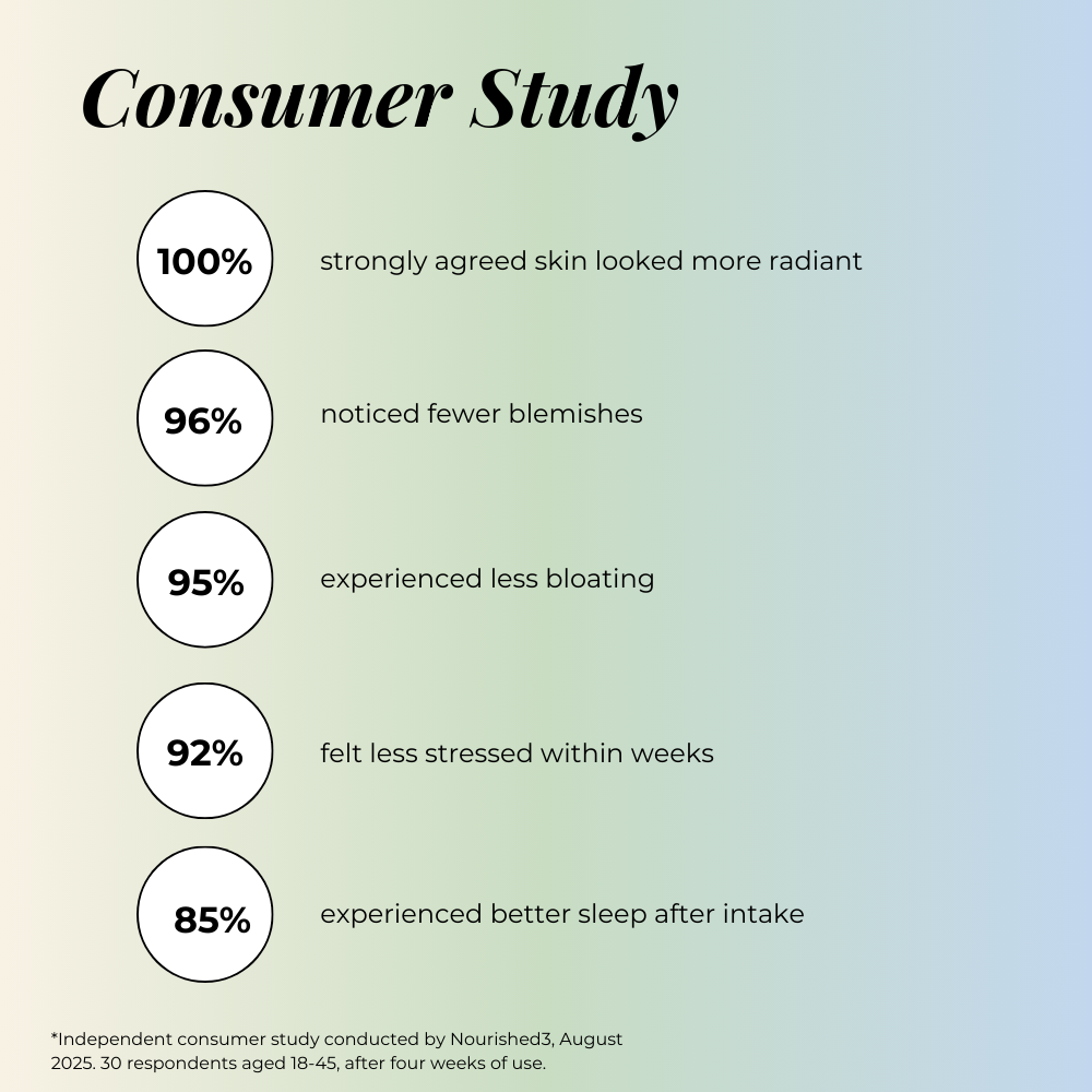 Clinically validated through an independent third-party study, this system has been proven to clear skin, nourish the gut, and calm the brain — delivering visible results today while building long-term resilience and true skin longevity.
