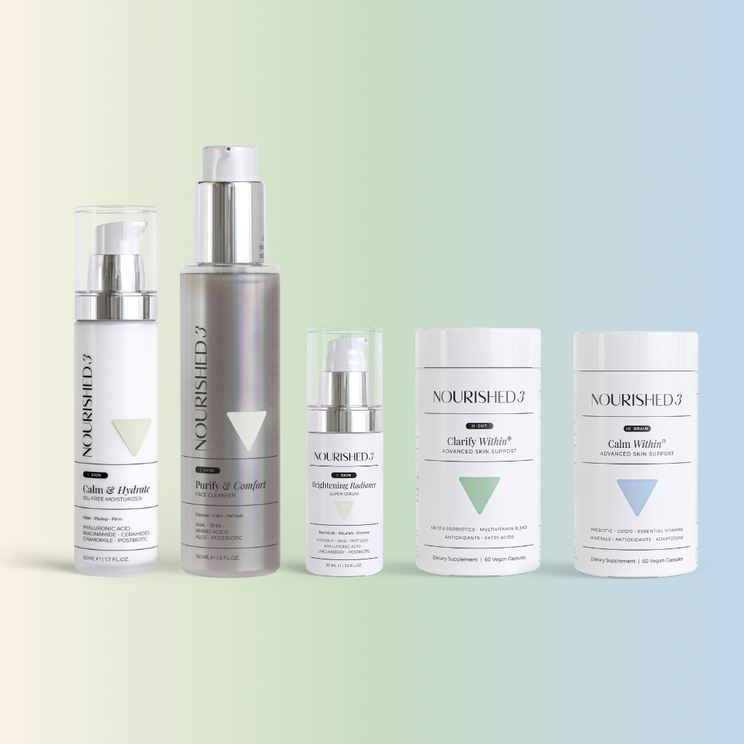 Lasting skin health comes from prevention, not just treatment. At Nourished3, we go beyond surface care with a complete inside-out system — the Triple Biotic™ Symbiotic Collection — combining skincare and supplements to target the skin–gut–brain axis from every angle.